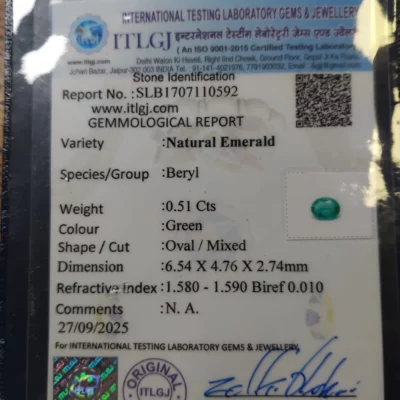 Émeraude naturelle verte 0,51 carat – Oval / Mixed – Certifiée ITLGJ