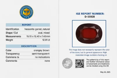 Découvrez la splendeur chaude et solaire de ce grenat hessonite naturel de 12.81 carats, une gemme rare et pleine de caractère, certifiée par le prestigieux Institut Gemmologique Espagnol (IGE).
